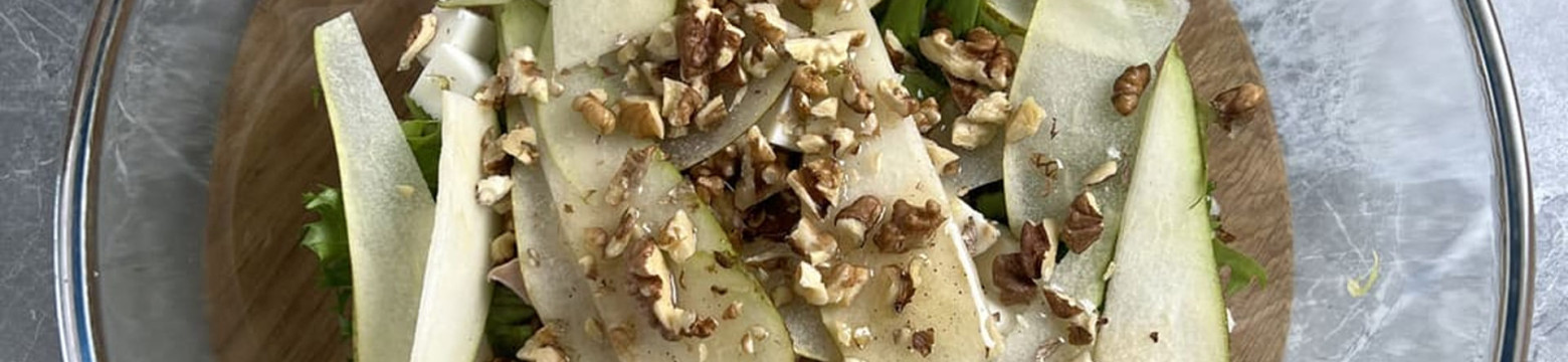 3. Викласти салатні листя, додати перепілку, сир, грушу та посипати горіхами.